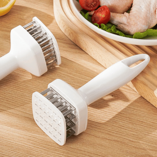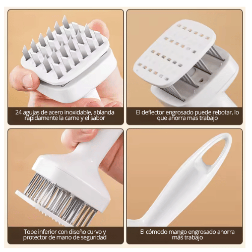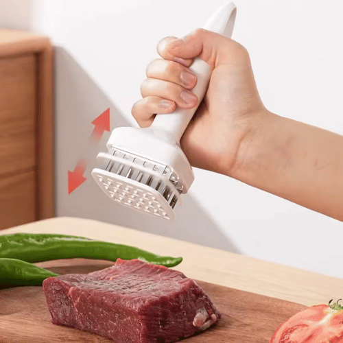 ¿Cansado de carnes duras o insípidas? Con nuestro Ablandador de Carne Manual, transformarás cualquier corte en una experiencia tierna y sabrosa. Este práctico utensilio penetra profundamente en la carne, rompiendo fibras duras para mejorar la textura y permitir una mejor absorción de marinadas y condimentos.