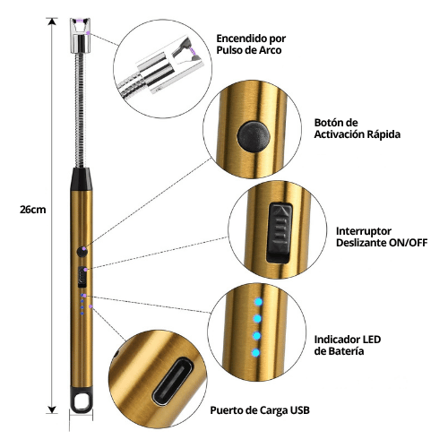 • Tipo: Encendedor de arco eléctrico sin llama • Alimentación: Batería interna recargable vía USB • Duración de carga: 1-2 horas • Autonomía: Hasta 100 usos por carga • Material: Aleación metálica de alta calidad • Tamaño: Compacto y portátil • Indicador LED de carga
