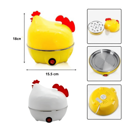 ✅ 3 funciones en 1: hierve, cocina al vapor y fríe ✅ Capacidad para 7 huevos al mismo tiempo ✅ Apagado automático para mayor seguridad ✅ Fácil de usar: solo agrega agua, coloca los huevos y enciende ✅ Diseño divertido y moderno con forma de gallina ✅ Compacta y portátil: no ocupa espacio y es ideal para llevar a todas partes ✅ Incluye accesorios prácticos: bandeja, sartén, vaso medidor y perforador
