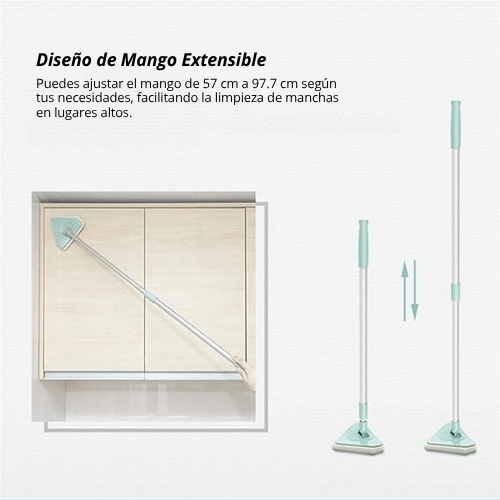 Llega a esquinas difíciles y superficies altas sin esfuerzo, gracias a su mango cómodo y sistema giratorio.