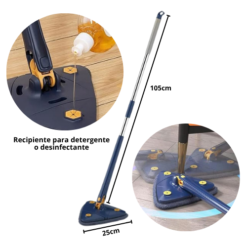 ✅ Cabezal triangular rotatorio 360° – Llega fácilmente a esquinas, bordes y espacios estrechos. ✅ Fácil de escurrir – Sistema práctico que evita ensuciarte las manos. ✅ Mopa de microfibra reutilizable – Alta absorción, atrapa polvo, pelos y suciedad al instante. ✅ Mango extensible – Ajusta la altura para mayor comodidad y limpieza sin esfuerzo. ✅ Ideal para todo tipo de pisos – Cerámica, madera, mármol, porcelanato, etc.